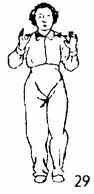 Теперь поднять носок левой ноги и сделать поворот направо на пятке левой ноги. Обе руки возвращаются назад, большие пальцы обеих рук находятся на расстоянии одного-двух цуней от груди, затем начинают раз водиться в стороны на одном уровне. Когда руки дойдут до уровня плеч, они останавливаются. Пальцы рук растопырены. Сделать маленькую задержку (рис. 29).