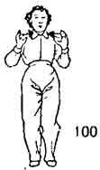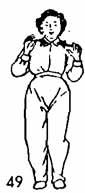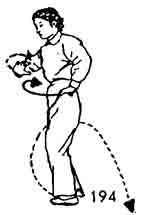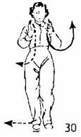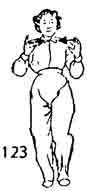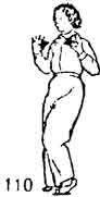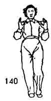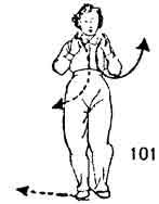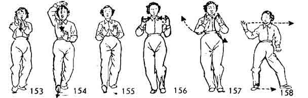 Продолжая, тело поворачиваем вправо во время поворота пятка правой ноги приподнимается и тоже поворачивается. Левая нога опускается с поворотом на 45°. Носки ставятся на одном уровне. Правая нога поднимается, а затем поворачивается направо, одновременно поднимается носок левой ноги и тоже поворачивается направо. Во время поворота правой ноги обе руки похлопывают по правой коленке (сначала левая, а затем правая). После этого правая нога опускается справа-сзади, ладони обеих рук прижаты к ребрам сбоку. Тело как бы описывает круг (рис. 194, 195).