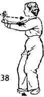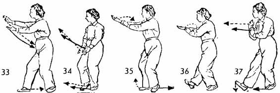 Продолжая, запястье левой руки повернуть вовнутрь так, чтобы ладонь смотрела вверх. Одновременно правая рука выдвигается вперед. Во время движения вперед ладонь смотрит вниз. Руки находятся в положении будто держат мяч. Во время движения обеих рук левая нога делает шаг назад и косо ставится на землю. Затем обе руки опускаются вниз как бы по дуге до нижней части живота. Во время опускания рук правая нога идет назад и останавливается на один цунь впереди левой ноги, носок следует по земле. Затем руки поворачиваются так, чтобы правая ладонь смотрела вверх, а левая — вниз (руки по-прежнему в положении будто держат мяч), затем они поднимаются до уровня груди и на одном уровне выдвигаются вперед. Одновременно правой ногой сделать шаг вперед. Левая нога следует за правой и останавливается на расстоянии одного цуня позади правой. Носок следует по земле. Затем левую ногу немного останавливаем и начинаем отводить назад. Одновременно обе руки двигаются назад и, как бы рисуя полукруг доводятся до правого плеча; ладони сердцем поворачиваются наружу. Одновременно центр тяжести переносится на левую ногу. Носок правой ноги поднимаем. Затем обе руки от правого плеча выдвигаем вперед на одном уровне Предплечья округлены. Левая рука находится на уровне запястья правой руки. Во время выдвижения рук вперед носок правой ноги медленно опускаем на землю. Левая нога становится на расстоянии двух-трех цуней от правой ноги (рис. 33–38).