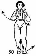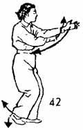 Теперь повернем левую руку, затем сжимаем правую руку в кулак и толкнем его под локоть левой руки причем в движении правая рука касается ребер. Одновременно правой ногой сделать шаг вперед и опустить ее возле левой ноги. Носок следует по земле. Расстояние между ногами полцуня. Немного остановиться. Затем правая нога возвращается назад. Левая нога следует на зад и ставится впереди правой ноги. Носок следует по земле. Положение рук не изменяется, и они не двигаются (рис. 42).