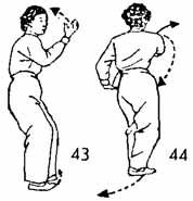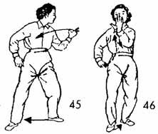 Продолжая, левую руку двигать к груди и остановить на расстоянии двух-трех цуней от большого пальца до груди, повернув ладонью вниз. Ладонь правой руки обращена вверх, и правая рука косо опускается вправо. В тот момент, когда руки опускаются вниз, носок правой ноги поднимается, пятка опирается на землю и, подобно завинчиванию шурупа, поворачивается во внутреннюю сторону. Во время поворота носок прямой или немного повернуть вовнутрь. Затем носок опускается на землю. Продолжая, левую руку от груди по дугообразной линии двигать в левую сторону. Большой палец находится на расстоянии одного-двух цуней от бедра. Одновременно левая нога делает косой шаг вперед. Пятка следует по земле. Затем ладонь правой руки поворачивается и поднимается вверх до уровня правого плеча; ладонь должна быть направлена налево. Кончик указательного пальца от правого уголка рта выдвигается вперед. Правая нога во время выдвижения правой руки вперед делает шаг вперед и становится позади левой ноги на два-три цуня сзади нее. Носок правой ноги движется по земле. Во время движения руки и ноги должны действовать Единым Духом (И-Ци), недопустим срыв дыхания (рис. 43, 44).