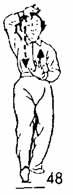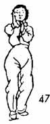 Продолжая, поднимаем носок левой ноги; пятку, наподобие завинчивающегося шурупа, повернуть во внутреннюю сторону. Правой рукой сделать дугообразный поворот в правую сторону. Большой палец находится на расстоянии двух-трех цуней от правого бедра. Левая рука поворачивается ладонью вверх. Вся рука продолжает подниматься до уровня правого плеча, поворачивается ладонью вправо, указательный палец левой руки от уголка рта выдвигается вперед. Все движения рук, ног и туловища такие же, только в правую сторону. Количество этих круговых движений неограниченно, но необходимо делать четное количество (т. е. в ту и в другую сторону) (рис. 45, 46).