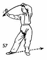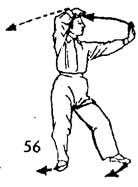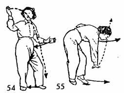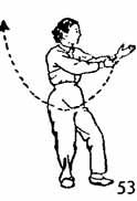 1. Продолжая предыдущее упражнение, правую ладонь направить вверх, потом — вниз, потом — назад, как бы рисуя целый круг, довести до лба и затем от лица направить вниз, как бы роняя, и остановить где-то за один чи от носка левой ноги. Левая рука вместе с правой рукой движутся назад и доходят до бедра, а ладонь левой поворачивается вниз. Левая нога, в то время как правая рука опускается вниз, отводится назад и ставится впереди правой на расстоянии одного-двух цуней. Носок следует по земле. Обе ноги немного согнуты. Взгляд устремлен на правую руку (рис. 54, 55).