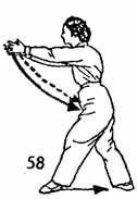 3. Теперь носок левой ноги поднять и повернуть (вместе с телом) направо. Во время поворота поднимается носок правой ноги и поворачивается направо. Одновременно с поворотом корпуса левая рука дугообразно поднимается вверх, тыльной стороной ладони достигая лба. Правая рука во время движения левой руки ото лба выдвигается вперед, где-то на уровень плеча, запястье расслаблено. Это движение подобно предыдущему, только в другую сторону (рис. 57).