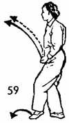 4. Продолжая движение, левую руку ото лба выдвинуть вперед до одного уровня с правой рукой. Ладони рук направлены друг к другу. В это же время сделать шаг назад правой ногой и по косой линии опускать ее на землю сзади левой ноги (расстояние между ногами в данной позиции зависит от человеческого роста и поэтому у разных людей неодинаково). Обе руки сжимаются в кулаки и из переднего положения дугообразно опускаются вниз и останавливаются впереди нижней части живота. Одновременно делается шаг назад левой ногой, и она ставится впереди правой на расстоянии одного цуня. Носок левой ноги следует по земле. Поясница опущена и расслаблена (рис. 58 и 59).