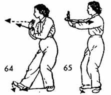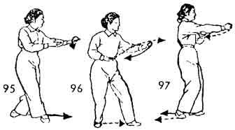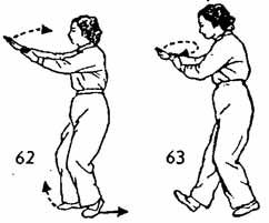 Продолжая, кулаки обеих рук разжимать и поднимать вверх (ладонь правой руки — наверх, ладонь левой руки — вниз), до уровня груди, а затем на одном уровне выдвинуть вперед. Одновременно делается шаг вперед правой ногой, левая нога следует за правой, доводится до «расстояния одного цуня от правой ноги, немного останавливается, а затем опять возвращается назад. Носок следует по земле. Затем обе руки описывают полукруг назад к правому плечу, ладони направлены наружу, одновременно центр тяжести переносится назад на левую ногу. Носок правой ноги поднимается. Затем обе руки от правого плеча на одном уровне выдвигаются вперед, предплечья рук немного изогнуты. Пальцы левой руки приближаются к запястью правой руки. Во время движения рук вперед носок правой ноги медленно опускается вниз. Левая нога находится на два-три цуня позади правой ноги (рис. 62–65).