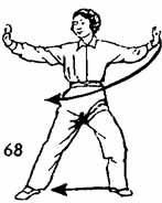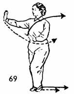 1. Продолжая, левой рукой вниз-вправо чертить как бы полукруг до уровня правого плеча. Во время движения левой руки левая нога движется к правой на расстояние до одного цуня, носок следует по земле. Немного остановиться (рис. 69).