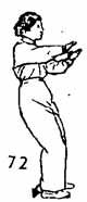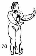 1. Продолжая, обе руки отвести слева направо (левая рука внизу). Руки ведутся до груди (локти касаются тела, большой палец направлен вверх). Правая рука поднимается до лица, затем выдвигается вперед и опускается (в это время большой палец смотрит вверх, где-то на уровне груди, руки чуть согнуты). Во время движения рук левая нога делает шаг назад, правая нога во время выдвижения правой руки вперед-вниз опускается прямо впереди левой ноги; носок следует по земле. Левая нога перпендикулярна правой ноге. Ноги чуть согнуты (рис. 71).