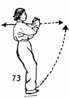 3. Продолжая, обе руки поворачивают так, чтобы пальцы смотрели вверх, запястья расслаблены. Положение подобно тому, как в упражнении "Закрывать руки". Одновременно пятка левой ноги поднимается и немного поворачивается, становясь на уровень с правой ногой. Немного задержаться в таком положении (рис. 73).