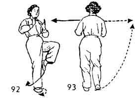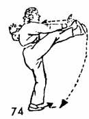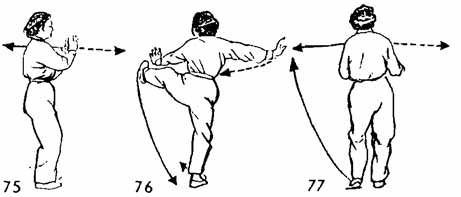 Продолжая, обе руки развести подобно тому, как в упражнении "Одиночный хлыст"; в это же время поднимается правая нога, носок ноги направлен вверх, нога поднимается и соприкасается с правой рукой. Взгляд направлен на правую руку, поясница немного расслаблена. Движение не прекращается. Затем правая нога опускается (ставится она возле левой ноги на расстоянии, которое зависит от роста человека). Затем левая нога приближается к правой. Носок следует по земле. Одновременно руки возвращаются в позицию Закрывать руки. Взгляд направлен на левую ногу (рис. 74, 75).