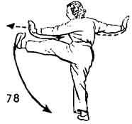 Продолжая, руки разводят в положение, подобное позиции "Хлыст". Левая нога поднимается и соприкасается с левой рукой. Затем левая нога опускается в прежнее положение, носок опускается и следует по земле. Одновременно руки возвращаются в позицию "Закрытие рук". Немного остановиться (рис. 76, 77).
