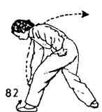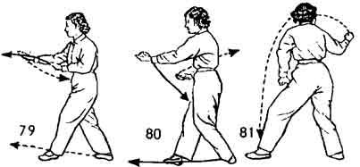 Теперь левую ногу опустить на землю впереди; носок повернут наружу и ставится косо. Во время опускания ноги левая рука отводится назад к левому бедру. Немного остановиться. Во время движения левой ноги правая рука из положения сзади начинает выдвигаться вперед-вниз (ладонь повернуть вверх). Немного остановиться. Затем правой ногой делается шаг вперед, и нога ставится впереди левой ноги. Носок поворачивается наружу и ставится косо на землю. Во время движения правой ноги левая рука от левого бедра выдвигается вперед, ладонь направлена вверх. Правая рука во время движения левой руки вперед возвращается назад на уровень груди, ладонь направлена вниз. Немного остановиться. Левой ногой делается шаг вперед. Носок направлен вниз. Немного остановиться. Левой ногой делается снова шаг вперед. Носок направлен вовнутрь. Во время движения левой ноги вперед левая рука поворачивается ладонью вниз, сжимается в кулак и ложится на левое бедро. Правая рука тоже сжимается в кулак и от правого бедра в направлении вверх-назад описывает дугообразную линию, а затем ударяет в сторону левой ноги. Тело в это время наклоняется вперед-вниз; в то время как правый кулак отводится назад по дуге, взгляд следит за движением руки вверх, а потом за ударом вниз. Все движения должны выполняться Единым Духом — И-Ци, поясница расслаблена (рис. 79–82).