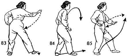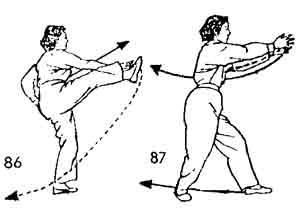 Теперь носок левой ноги повернуть вовнутрь. Одновременно правый кулак описывает дугу назад-вверх, внутренняя сторона кулака направлена вверх, тело вслед за рукой поворачивается направо. Затем правый кулак опускается вниз на правое бедро спереди. Одновременно правая нога немного опускается назад. Носок правой ноги стоит косо, направлен наружу; во время движения сжатая в кулак правая рука направляется вниз, левая рука от левого бедра поднимается вверх до лица, затем начинает, опускаться и от груди по дугообразной линии опускается на левое бедро. Во время поднятия вверх левой руки левой ногой делается шаг вперед, и она опускается впереди правой ноги. Носок левой ноги ставится косо и направлен наружу. Правый кулак от правого бедра поднимается вверх и выдвигается вперед, внутренняя сторона направлена вверх. Правая нога поднимается и выбрасывается вперед. Одновременно правая рука касается правой ноги. Рука и нога находятся на уровне груди. Теперь правую ногу опустить и поставить позади левой ноги. Правая рука в это время не двигается. Во время движения правой ноги левую руку выдвинуть вперед, остановить немного сзади правой руки, ладони направлены вовнутрь, поясница расслаблена и опущена. Немного остановиться (рис. 83–87).