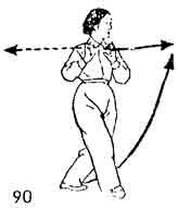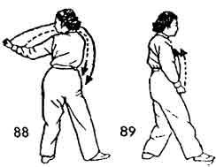 Продолжая, левой ногой сделать шаг назад за правую ногу, обе руки сжимаются в кулаки, идут вниз. Во время движения рук носок правой ноги поднимается и поворачивается во внутреннюю сторону. Обе руки в это время не останавливаются, продолжая медленно идти назад от левого бедра. Затем идут вверх и опускаются у нижней части живота как бы описывая круг. Немного остановиться. Одновременно пятка левой ноги поднимается и поворачивается наружу. Кулаки обеих рук разжимаются, руки поднимаются до уровня груди, ставятся в позицию Закрытие рук". Во время поднятия рук носок правой ноги поворачивается наружу и опускается. Обе ноги чуть согнуты. Левое бедро прижато к внутренней стороне правого бедра. Поясница расслаблена. Тело прямое. Взгляд устремлен вперед (рис. 88–90).