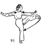 Теперь правую ногу и тело немного поворачивают налево, затем поднимается левая нога, одновременно разводятся руки Руки и нога находятся на одной прямой линии. Взгляд направлен на указательный палец левой руки (рис. 78).