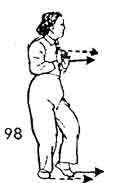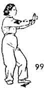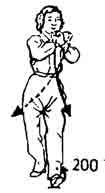 Продолжая, оба кулака вслед за поворотом туловища направо повернуть во внутреннюю сторону; ладони направлены вверх (правый кулак лежит на запястье левой руки, локти прижаты к ребрам). Во время поворота кулаков вовнутрь левая нога поворачивается вовнутрь, а правая отступает немного назад. Расстояние между ногами строго не определено и зависит от роста человека. Носок направлен косо наружу. Вслед за этим левый кулак из-под запястья правой руки поворачивается наружу, пока внешняя сторона правого запястья не соприкоснется с внутренней стороной правого запястья (высота где-то на уровне груди), и образует нечто вроде вилки (расстояние между запястьем и грудью три-четыре цуня). Поясница опушена вниз и расслаблена, обе ноги немного согнуты. Оба запястья на одном уровне вращаются наружу. Во время этого вращения носок левой ноги поднимается и немного подвигается вперед. В это время центр тяжести переносится на правую ногу. Оба локтя направлены прямо вниз. Обе ноги согнуты. Взгляд направлен между кулаками. Немного остановиться (рис. 199, 200).