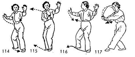 Теперь вернуть левую ногу и поставить на одном уровне с правой ногой. Во время движения левой ноги левая рука опускается вниз к нижней части живота, затем поднимается вверх справа от груди и, как бы описывая дугообразное движение, возвращается в прежнее положение ("Хлыст"). Одновременно левая нога от правой ноги направляется в левую сторону, носок левой ноги немного повернут наружу. Во время движения левой руки в прежнее положение правая рука опускается вниз, к нижней части живота, затем поднимается вверх до уровня глаз и возвращается в прежнее положение. Одновременно правая нога приближается к левой ноге и ставится позади нее на расстоянии двух-трех цуней. Затем она снова возвращается в прежнее положение. Позиция подобна позиции" Хлыст". После этого левой ногой сделать шаг вперед и поставить ее впереди правой ноги. Носок направлен наружу и следует по земле. Обе ноги немного согнуты. Во время движения левой ноги вперед обе руки опускаются вниз-вперед (ладони рук направлены наружу, ладонь левой руки на правой руке). Обе руки начинают описывать круг вправо и влево. Ладонь правой руки поворачивается вверх; ладонь левой руки смотрит вниз у груди. Когда обе руки соединяются, они выдвигаются вперед (рис. 113–117).