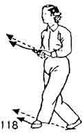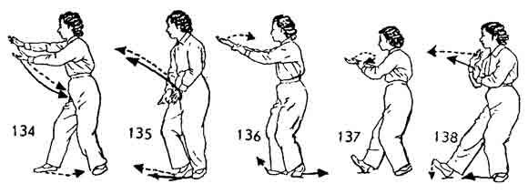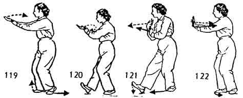 Теперь правой ногой сделать шаг вперед. Левая нога подвигается за правой (позади нее) на расстояние одного цуня. Носок следует по земле. Затем левая нога возвращается назад. Одновременно левая рука ложится на запястье правой руки. Затем обе руки идут назад к правому плечу. Ладонь правой руки поворачивается наружу. Центр тяжести тела перемещается на левую ногу. Носок правой ноги поднимается, обе руки выдвигаются вперед. Левая нога подвигается к правой ноге на расстояние два-три цуня. Носок следует по земле. Взгляд устремлен на указательный палец правой руки (рис. 118–122).