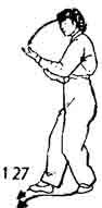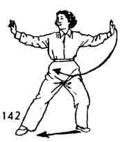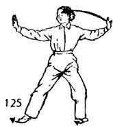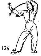 Продолжая, левую руку поднять вверх и, описывая дугу, достигнуть лба тыльной частью ладони. Тело поворачивается вправо. Левая нога тоже поворачивается вправо, а правая нога поворачивается наружу (носок направлен наружу). Запястье правой руки расслаблено и не движется. Взгляд направлен на указательный палец правой руки (рис. 126).