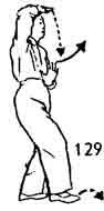 3. Теперь левую ногу повернуть вовнутрь. Одновременно тело поворачивается направо, левая рука опускается, ладонь направлена вниз. Внутренняя часть запястья прислонена к сердцу. Во время движения левой руки вниз правая рука поворачивается, чтобы ладонь смотрела вверх, и медленно поднимается вверх (локти по-прежнему прислонены к телу). Затем запястье правой руки поворачивать наружу, поднять вверх до соприкосновения тыльной стороны ладони со лбом. В это же время делается шаг вперед правой ногой. Левая нога следует за правой и опускается на расстоянии двух-трех цуней позади нее. Одновременно левая рука от груди медленно выдвигается вперед, но не слишком далеко (локоть прижат к телу) (рис. 129).