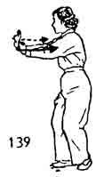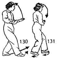 4. Теперь правой ногой сделать маленький шаг вперед, одновременно правая рука опускается до уровня груди, ладонь направлена вниз. Ладонь левой руки поворачивается и смотрит вверх, потихоньку начиная подниматься. Оба локтя прислонены к телу. Положение схоже с начальным в этой позиции. Затем делается шаг вперед левой ногой, левое запястье поворачивается в наружную сторону и поднимается вверх. Правая нога тоже делает шаг. Позиция аналогична позиции, изображенной на рис. 128 (рис. 130, 131).