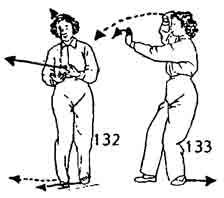 5. Продолжая, тело поворачивают в правую сторону, и все движения рук и ног делают как бы в позиции, изображенной на рис. 131. Правая нога делает шаг вперед, левая рука выдвигается вперед, левый локоть немного согнут (рис. 132, 133).