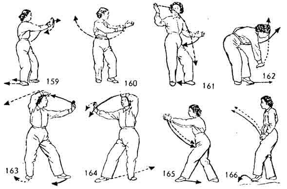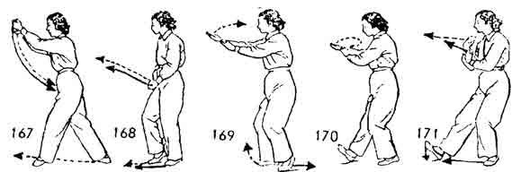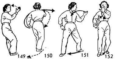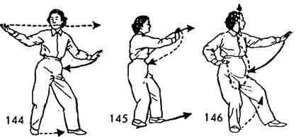 Теперь обе руки поворачивают в правую сторону; правая ладонь обращается вверх, левая рука опускается вниз по дуге и останавливается у левог o бедра. Правая рука выдвигается вперед-прямо, запястье расслаблено. Правая нога во время движения правой руки подтягивается к левой ноге и ставится сзади нее на расстоянии одного цуня. Левая рука выдвигается вперед. Правая рука одновременно возвращается назад к правому бедру. Во время движения рук левая нога делает шаг вперед. Обе ноги согнуты. Вес тела перемещается на правую ногу. Взгляд направлен на левую руку (рис. 144–146).