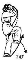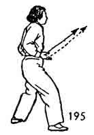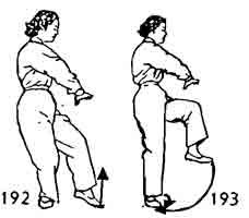 Теперь обе руки разводить. Левую руку остановить возле левого бедра. Одновременно правую руку повернуть ладонью вверх и продолжать опускать вниз. Затем завести ее назад, провести возле лба. После этого повернуть руку ладонью вниз и опустить к нижней части живота. Одновременно правая нога делает шаг назад, носок направлен наружу (стоит косо). Во время движения правой руки вниз левая нога подвигается к правой ноге на расстояние около одного цуня, носок следует по земле. Обе ноги согнуты, поясница расслаблена. Затем правая рука поворачивается ладонью вниз и поднимается до уровня груди. Во время поднятия правой руки левая нога тоже поднимается, тело с движением рук и ног тоже приподнимается (рис. 192.193)