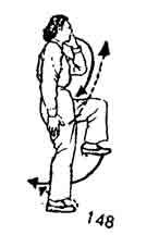 2. Теперь правую ногу опустить вниз-вперед. Нога согнута. Поясница расслаблена. Тело прямое. Одновременно правая рука по дуге опускается вниз к правому бедру (пальцы вниз). Левая рука от левого бедра поднимается вверх, пальцы и ухо на одном уровне. В то же время левая рука "приклеивается" к правой и поднимается вверх. Позиция схожа с положением, изображенным на рис. 147, где поднята правая нога, а здесь — левая (рис. 148).