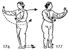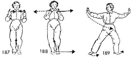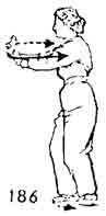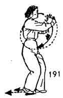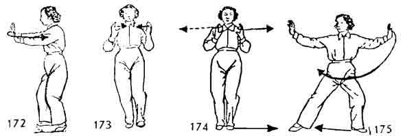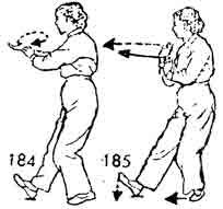 Теперь левой ногой сделать шаг назад, правый носок приподнимается. Одновременно ладонь правой руки пово рачивается вверх, затем — вправо, назад и описывает полукруг. Левая рука поворачивается вслед за правой рукой, ладонь правой руки направлена наружу. Левая рука прикасается к запястью правой руки, и обе выдвигаются вперед (рис. 184–186).