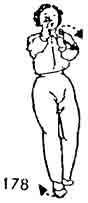 3. Левой ногой делают шаг вперед и ставят ее на уровне носка правой ноги. Руки по-прежнему впереди груди, только ладони поворачивать и менять, правая — вверх, левая — вниз. Обе ноги немного согнуты. Запястья обеих рук поворачиваются наподобие вилки, большой палец левой руки находится против передней части груди (рис. 180, 181).