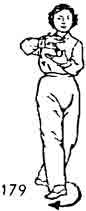 2. Носок правой ноги поворачивается наружу и находится на одном уровне с носком левой ноги. Одновременно поворачивается левая рука, и ее ладонь обращается вверх. Правая рука тоже поворачивается, но ладонью вниз и находится над левой рукой (расстояние между ладонями три — четыре цуня, между руками и грудью один-два цуня) (рис. 179).