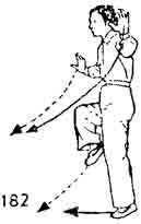 Теперь поднимать правую ногу, подошва направлена вниз (нога на уровне колена), одновременно руки отводятся в стороны подобно тому, как в позиции "Хлыст". Взгляд направлен вперед (рис. 182).