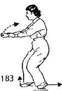 Продолжая, направить взгляд вперед-вниз. Затем обе руки выдвигаются вперед, левая рука лежит на запястье правой руки, правая рука, выдвигаясь вперед, сжимается в кулак. Взгляд направлен на правую руку. Во время движения рук правая нога опускается впереди, затем левой ногой делается шаг вперед, и она ставится сзади правой ноги на расстоянии одного цуня. Носок следует по земле. Во время движения ног тело уподобляется летящей птице, которая устремляет свою силу вниз для взлета (рис. 183).