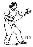 Теперь ладонь правой руки повернуть и опустить вниз к правому бедру, одновременно ладонь левой руки поворачивается вниз. Во время движения рук центр тяжести тела перемещается на правую ногу. Взгляд направлен на указательный палец левой руки (рис. 190).