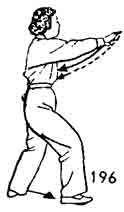 Продолжая, обе руки выдвигают вперед на уровень плеч, ладони обеих рук поворачиваются вниз (обе руки немного согнуты). Центр тяжести перемещается на правую ногу. Взгляд направлен в центр между руками (рис. 196).