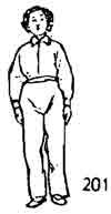 Теперь обе руки одновременно развести друг от друга и опустить вправо и влево к бедрам, ладони спускаются к бедрам; одновременно левая нога приставляется к правой ноге; пятки ног соединены вместе, между носками образуется угол в 90°. Тело должно стоять вертикально (рис. 201).