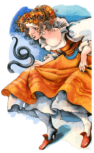 Как только девушка вернулась домой, мать кинулась к ней навстречу: — Это ты, доченька? Ну как? — А вот так, матушка! — буркнула в ответ дочка, и в то же мгновение две гадюки и две жабы плюхнулись на порог. — Ах, боже мой! — вскрикнула мать. — Да что же это такое? Откуда?.. А, знаю! Это твоя сестра во всём виновата. Ну, поплатится же она у меня!.. — И она кинулась на младшую дочку с кулаками.