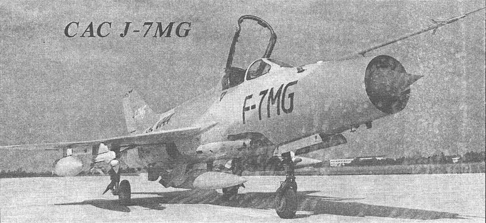 В 1993 году истребители J-7E начали поступать в строевые части китайских ВВС. В ноябре 1996 года во время Китайского авиашоу в Жухае был впервые публично продемонстрирован экспортный вариант F-7MG (G - от китайского слова "гай" - "модернизированный"), сочетающий аэродинамические усовершенствования J-7E и западную авио-нику F-7M. По утверждению китайских специалистов, маневренные характеристики новой машины по сравнению с F-7M улучшились на 43%. Суммарная боевая эффективность при ведении ближнего маневренного воздушного боя возросла на 83,9%, скороподъмность -на 24%, снижение взлетной дистанции на 30% и посадочной дистанции - на 28,6%. За счет улучшения эргономики кабины снижена нагрузка на летчика. Улучшены также эксплуатационные характеристики самолета, повышен ресурс планера и силовой установки. Велись переговоры о поставках самолетов F-7MG ВВС Бангладеш. Для Пакистана была разработана модификация F-7PG, незначительно отличающаяся от J-7 составом бортового оборудования и вооружения. В настоящее время на вооружении ВВС Китая имеется 250 самолетов J-7 всех модификаций, еще 180 машин имеется в составе морской авиации. Можно предположить, что в начале 2000-х годов в Китае начнутся большие работы по модернизации парка этих истребителей. КОНСТРУКЦИЯ. Самолет выполнен по нормальной аэродинамичкекой схеме с треугольным крылом и цельнопо-воротным горизонтальным оперением. Крыло самолета имеет двойную стреловидность по передней кромке (57 и 42°). Имеются односекционные маневренные предкрылки, положение которых автоматически регулируется в зависимости от угла атаки, скорости и высоты полета. Имеются закрылки и элероны. В корневой передней части крыла сформированы интегральные топливные баки. Фюзеляж - типа полумонокок. Фонарь имеет плоское лобовое бронестекло и колпак, откидывающийся назад. Катапультное кресло китайского производства обеспечивает покидание истребителя при нулевой высоте в диапазоне приборных скоростей 130-850 км/ ч. На пакистанских самолетах установлено кресло Мартин-Бейкер Mk.lOL. Шасси - трехопорное. Основные опоры имеют колеса 600x200 мм, передняя опора - управляемая (угол поворота ±47") с пневматиком 500x180 мм. Минимальный радиус разворота самолета - 7,04 м. СИЛОВАЯ УСТАНОВКА. Самолет оснащен ТРДФ LMC WP13F (4400/6500 кгс). Топливо размещено в шести мягких фюзеляжных и двух интегральных крыльевых топливных баках суммарной емкостью 2385 л. Под фюзеляжем может подвешиваться ПТБ на 500 или 800 л, а под крылом, на внешних узлах -два по 480 л. Имеется централизованная система заправки топливом. ОБЩЕСАМОЛЕТНЫЕ СИСТЕМЫ. Кислородная система - Янхай YX-3. Имеется двухканальный автопилот. ЦЕЛЕВОЕ ОБОРУДОВАНИЕ. Самолет F-7MG оснащен усовершенствованной системой управления огнем, основу которой составляет малогабаритная многоцелевая БРЛС GEC-Маркони "Супер Скайренджер" с полностью программируемым цифровым процессором. Станция, размещенная в конусе воздухозаборника, имеет антенну с углами обзора ±20°. Обеспечивается сопровождение нескольких целей "на проходе", а также возможность обнаружения и сопровождения целей на фоне земли. Имеются специальные режимы ближнего воздушного боя, а также режим картографирования. В кабине установлен ИЛС GMAv Тип 956, на который выводится полетная и прицельная (в том числе и радиолокационная) информация, а также информация, обеспечивающая управление во