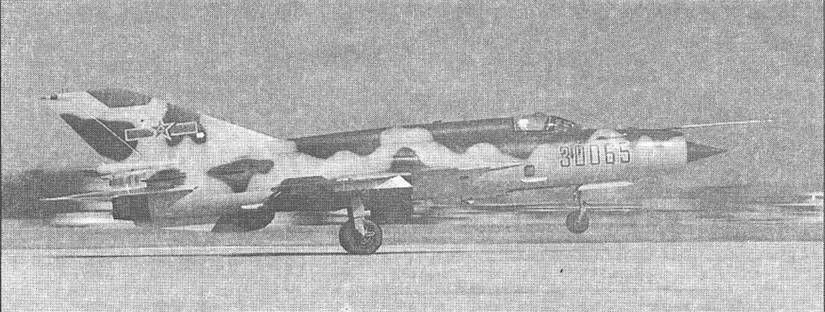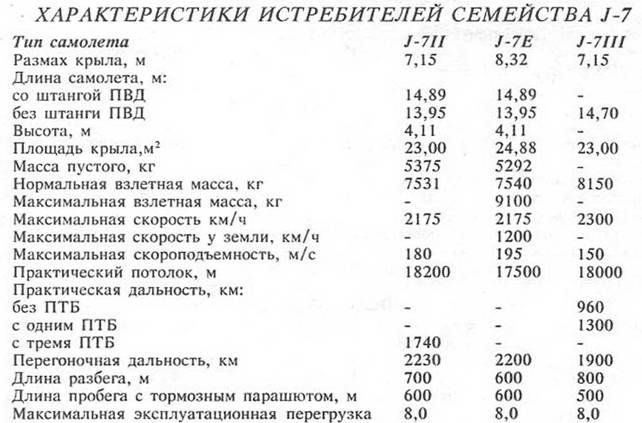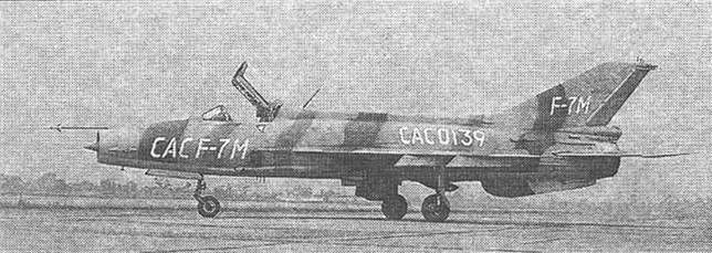 F-7III - отличался накладным баком на фюзеляже, 23-мм пушкой, установкой на фонаре зеркала заднего amp;ида. Первый полет - 26 апреля 1984 г. Самолеты "Эргард" поставлялись в Бангладеж (16 единиц), Иран (18), Мьанму (24) и Зимбабве (22). Их серийный выпуск продолжался До конца 1990-х годов. Своеобразным гибридом F-7M и F-7В стал самолет F-7BS, созданный в 1991 году для Шри Ланки. Сохранив конструкцию фюзеляжа и простую китайскую авионику F-7B эта машина получила крыло от F-7M с четырьмя узлами внешней подвески. Ланкийским ВВС поставлено четыре самолета этого типа. Специально для стратегического союзника Китая - Пакистана - была разработана модификация F-7P "Скай-болт", близкая модели F-7M. Основным отличием этого самолета от "Эргарда" являлась установка катапультного кресла Мартин-Бейкер Mk.IOL английского производства. Ракетное вооружения истребителя состояло из четырех УР AIM-9 "Сайдуиндер". В 1988-91 гг. Пакистан получил 24 самолета этого типа. Дальнейшим развитием F-7P стал истребитель F-7PM, также созданный под требования ВВС Пакистана. Усовершенствования коснулись, главным образом, авионики (в соответствии с контрактом, подписанным в 1989 году вносилось около 100 изменений). В частности, самолет получил новое радионавигационное оборудование фирмы Коллинз и цифровое радиосвязное оборудование. В 1993 году между Китаем и Пакистаном было подписано соглашение об установке на самолеты F-7P и F-7PM вместо радиодальномера "Скайранджер" миниатюрной БРЛС FIAR "Грифо" 7 с дальностью обнаружения воздушных целей более 55 км. В мае 1996 года начались летные испытания этой станции на летающей лаборатории F-7. Все вышеперечисленные модификации "семерки" относились к классу дневных истребителей, способных действовать лишь по визуально наблюдаемым целям. В то же время ВВС КНР остро нуждались в новом легком всепогодном истребителе, способном заменить морально устаревшие всепогодные перехватчики J-6 (МиГ-19П и ПМ). Однако создание такой машины долгое время сдерживалось неспособностью китайской радиоэлектронной промышленности поставить компактную и достаточно мощную БРЛС, размещеную в конусе воздухозаборника истребителя. В 1981 году в Чэнду совместно с фирмой GAIC (г.Гуанчжоу) началось проектирование первой всепогодной версии китайского МиГ-21 - фронтового истребителя-перехватчика J-7II1, в общих чертах соответствующего советскому истребителю МиГ-21 МФ. Параллельно велись работы и над легкой БРЛС, предназначенной для установки в носовом конусе истребителя. В частности, были созданы опытные радиолокационные станции "317" и "317А", прошедшие испытания на наземных стендах и летающих лабораториях. Сборка первого самолета J-7III, занявшая месяц, завершилась в феврале 1984 года, а первый испытательный полет новой машины, пилотировавшейся летчиком Ю. Мингуэном, состоялся 26 апреля 1984 года. В 1992 году истребитель J-7III начал поступать в части ВВС Китая. Его серийное производство продолжалось до 1996 года. Самолет оснащен многоцелевой РЛС JL-7, обеспечивающей борьбу с воздушными целями, а также способной действовать по наземным целям в режиме радиодальномера. Самолет получил более мощный двигатель WP13, дополнительный топливный бак в увеличенном гаргроте, крыло с четырьмя узлами подвески (как у F-7M), новый фонарь с крышкой, откидывающейся на бок (ухудшение обзора назад из кабины было частично компенисировано установкой перископа), н