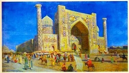 Чалмы белые, пестрые и огненные мешаются с киргизскими войлочными шляпами, расшитыми черным орнаментом. Затканные золотыми нитками тюбетейки сверкают на солнце быстро переливающимся светом. Бухарские еврейки ходят по базару, прикрыв лицо углом надетого на голову яркого зеленого халата. Ислам наложил свой отпечаток даже на эту, обычно туго поддающуюся чужим обрядам расу. Бухарские еврейки покрывала не носят, но при мусульманах лицо закрывают. К текущим лавой разноцветным толпам подъезжают все новые конные группы. Сегодня базарный день. Тонколицые горные таджики разгружают своих верблюдов, и по боковым уличкам, выбивая копытами непроницаемые пыльные завесы, движутся стада курдючных баранов. Внезапно воздух наполняется нестерпимой вонью. Это подул ветерок от лавочек, торгующих местным, похожим на головки шрапнелей мылом. Медные ряды оглушают звонким клепаньем молоточков: чеканят блюда, чайники и кумганы. Половину базара занимает торговля московскими, пестрейшими ситцами. В лавочках тесно. Кипы мануфактуры стоят корешками, как книги на библиотечных полках. Пробиться в эти ряды почти невозможно. Уж с прохладного рассвета они туго набиты покупателями. В конце главной базарной улицы расположен Регистан Высоко в небе летают стрижи над тремя прославленными памятниками мусульманской архитекторы. Блещут на солнце изразцовые желтые львы мечети Шир-Дор. Квадратным обжигающим кубом на площади стоит солнечный свет. И выше стрижей, выше голубых минаретов Улуг-Бека мчатся над Самаркандом белокрылые коршуны.