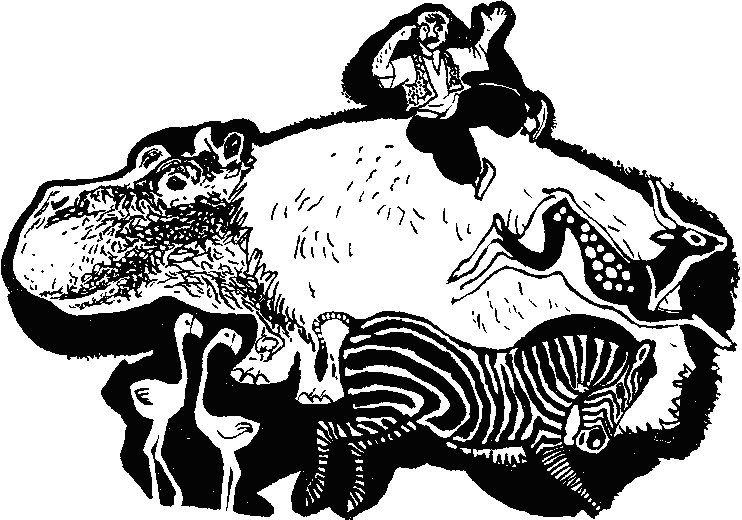 "Манук" - читать интересную книгу автора (Бабич Ирина)ХРАБРЫЙ НАЗАРРепетиция аттракциона Петросяна задерживалась: надо было договориться с осветителями, отнести в оркестр ноты, установить сложные декорации. А народу в цирке тем временем становилось всё больше и больше: ведь артисты цирка ездят по всей стране, кочуя из одной программы в другую, и о многих номерах и аттракционах знают только по рассказам и газетным рецензиям. Всем хотелось посмотреть работу Петроса Петросяна. Там были заняты, как говорилось в афише, экзотические животные, то есть редкие животные далёких стран. «Гвоздём» этого аттракциона были дрессированные бегемоты, с которыми не выступает больше никто из советских, да, пожалуй, и зарубежных дрессировщиков. И даже приготовления к репетиции были необычными. Ну, скажите, видали ли вы когда-нибудь в цирке… занавес — такой, чтобы скрыл от зрителей всю круглую арену? Нет? А тут по команде Петросяна на манеж опустился откуда-то сверху огромный чёрный колпак, похожий на гигантский колокольчик — верхушка его была подтянута повыше, а края плотно прилегали к барьеру. И оттуда, из-под колпака, доносились какие-то непонятные звуки, будто кто-то большой недовольно фыркал и бурчал. Всё это было очень интересно — вот почему на репетицию пришли и артисты, и их помощники, и рабочие манежа, и кассирша. За минуту до начала в первом ряду появился директор. Около него топтался и что-то сердито говорил инспектор манежа — дядя Коля. — Бросьте, Николай Константинович, — потрепал его по плечу директор, — не надо портить себе и мне настроение. Бегемоты — не нервные дамочки! Отработают, как миленькие. Давайте лучше смотреть: я ведь этот аттракцион в первый раз вижу. Свет в цирке погас, и дядя Коля, недовольно ворча, поднялся на несколько рядов выше, туда, где сидела, затаив дыхание, Тина. И пока он пробирался к ней, наступая кому-то на ноги и поминутно извиняясь, из ложи оркестра полилась тихая нежная музыка. Чёрный бархатный «колокольчик» внезапно взмыл вверх, под купол, и свернулся там в тугой комок. А на арене, будто залитой настоящим солнечным светом, все увидели своими глазами прекрасную сказочную страну. За невысокой оградой росли зелёные пальмы, и на них качались, гортанно перекрикиваясь, яркие, как цветы, попугаи. Форганг был закрыт занавеской из бамбуковых палочек, а перед ним возвышалась большая серая скала. В прозрачном озерке отражался зелёный бархатный бугор и мокло толстое шершавое бревно. По жёлтому песку разгуливали розовые фламинго. А под скалой в узенькой полоске тени блаженно похрапывал герой весёлых армянских сказок — храбрый Назар. Он был в длинном оранжевом кафтане, в широченных голубых шароварах, а на голове его кокетливо сидела маленькая красная феска с кисточкой — кисточка свисала прямо на толстый нос Назара и его густые чёрные усы. Но вот Назар приоткрыл один глаз, потянулся, сел, подмигнул залу — и в зале засмеялись. Бывает же так: ничего особенного не сделает человек, просто вздохнёт или раскинет руки — а людям вокруг уже весело. А Назар тем временем вспомнил, как видно, о чём-то очень приятном: его круглое краснощёкое лицо так и расплылось в улыбке. Он залез в карман необъятных своих штанов и вытащил оттуда ситцевый узелок. В узелке оказалась тарелочка с аппетитными рыбками, длинный белый хлебец и фляжка. Назар расс
