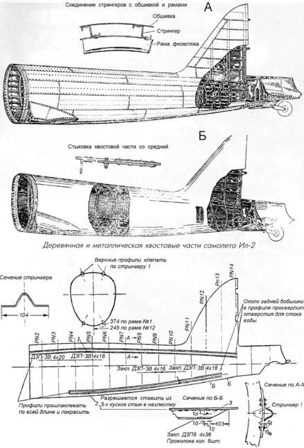 Наконец, Постановлением ГКО от 26 апреля 1942 г. производство Ил-2 на заводе № 381 было свернуто в пользу выпуска истребителей Ла-5. Таким образом, к лету 1942 г. сформировались две производственные базы по выпуску Ил-2: московская - заводы №№ 30, 45 и 125, и куйбышевская - заводы №№ 1,18, 24 и 207. В ходе серийного выпуска в конструкцию Ил-2 вносились различные изменения, связанные как с адаптацией технологии производства к местным условиям, так и с устранением выявленных в ходе боев дефектов и недостатков. Так, уже летом 1941 г. от цельнометаллической конструкции крыла перешли к смешанной: лонжероны металлические, центроплан цельнометаллический, обшивка, стрингеры и нервюры отъемной части крыла -из фанеры и дерева, или из дюралюминия. Хвостовая часть фюзеляжа поначалу выпускалась и в цельнометаллическом и деревянном варианте, но с лета 1942 г. заводы практически полностью перешли к деревянной конструкции. Специальным распоряжением НКАП и ВВС с целью снижения потерь на всех Ил-2, выпущенных авиазаводами до 1 июня 1942 г., при восстановительном ремонте надлежало силами реморганов выполнить усиление хвостовой части самолета путем постановки на всю длину фюзеляжа четырех наружных дюралюминиевых стрингеров - два сверху и два снизу. Стрингеры приклепывались к фюзеляжу вместе со стыковочной лентой заклепками. На серийных заводах усиление хвостовой части фюзеляжа Ил-2 проводилось постановкой шести дополнительных внутренних стрингеров и увеличением толщины обшивки путем добавления нескольких слоев шпона. Прозрачная 64-мм броня за головой летчика была заменена металлической 12-мм броней. Дополнительная броня (6 мм) устанавливалась сверху заднего бензобака и на подвижной части фонаря над головой летчика (5 мм). Кроме этого, дюралевый лист над мотором был заменен бронелистом толщиной 5 мм. Общий вес брони возрос до 811 кг. С начала 1942 г. вместо авиаброни АБ-1 был освоен выпуск брони АБ-2 с меньшим содержанием никеля (в 2 раза) и молибдена (в 3 раза), но такой же по пулестойкости. В сентябре-октябре 1941 г. в Ленинграде на заводе К-4 была разработана технология изготовления прозрачного бронестекла на основе незакаленного силикатного стекла без применения дефицитного сталинита. По пулестойкости и прозрачности новое бронестекло вполне соответствовало требованиям ВВС и было запущено в массовое производство. Следует сказать, это изобретение дало огромную экономию государственных средств. Если один комплект бронестекла на основе сталинита для Ил-2 стоил 14 тысяч рублей, то комплект из незакаленного силикатного стекла - всего 4 тысячи рублей. На 70 кг был поднят запас горючего за счет увеличения объема заднего бензобака. Установили второй электросбрасыватель ЭСБР-Зп с самостоятельным управлением от кнопки на ручке управления и осуществили рациональное размещение радиооборудования. Для снижения вероятности пожара при прострелах бензобаков на самолете была смонтирована система заполнения их углекислотой (С02). Баллон емкостью 2л, наполненный жидкой углекислотой под давлением 150 атм, располагался в фюзеляже в закабинном отсеке и соединялся трубопроводами с каждым из бензобаков. Запорный кран углекислот-ной установки открывался летчиком после взлета и набора высоты и оставался открытым на протяжении всего полета. Заправка Ил-2 первых серий бензином осуществлялась че