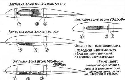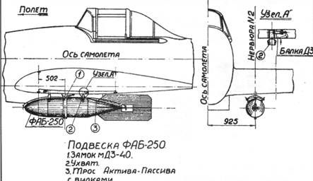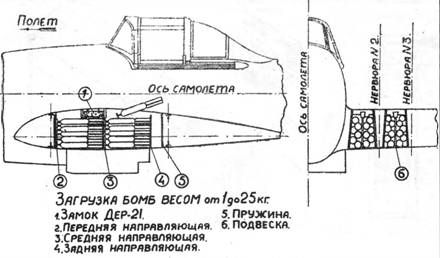 По этой причине в октябре 1942 г. была проведена модернизация бомбардировочного вооружения Ил-2. Из состава вооружения самолета были изъяты КМБ-2 и балки для подвески 250-кг бомб и спецприборов (ВАП-250, УХАП-250). Это упростило производство штурмовика на заводах и одновременно облегчило его эксплуатацию в строевых частях. Калибры загружаемых бомб и спецприборов, управление сбрасыванием (пиротехническое и механическое) остались прежними. Изменился лишь способ загрузки бомб. Мелкие бомбы калибра 1-25 кг теперь загружались непосредственно в бомбоотсеки самолета на створки бомболюков, через окна, сделанные в верхней обшивке крыла. Для подвески 50 кг и 100 кг бомб внутри бомболюка оставлены замки Дер-21, но ухваты, служившие для предотвращения качания бомб, ликвидированы - их роль выполняли наклонные боковые стенки бомболюка. Подвеска бомб калибров 50, 100, 250 кг и спецприборов снаружи осуществлялась на замки МДЗ-40, вмонтированные в нижние балки нервюр центроплана. При этом для бомб 50 кг и 100 кг были оставлены складывающиеся ухваты, а для бомб 250 кг и спецприборов сделаны легкосъемные ухваты. В ходе эксплуатации универсальных бомбоотсеков имели место случаи, особенно «при полетах с полевых неблагоустроенных аэродромов», самопроизвольного раскрытия створок бомболюков и последующим выпадением и взрывом бомб под фюзеляжем. В ряде случаев это приводило к тяжелым последствиям. Этот дефект был связан с неправильной регулировкой длины штока тяги замка, при которой крюк не полностью входит в свое гнездо и между концами трубы и крюком образуется зазор. После усиления тяги замка запирания створок бомболюков, дефект больше не проявлялся. «Негладкая внутренняя поверхность стенок и створок бомболюков благодаря выступанию заклепок, листов жесткости и др. деталей люка» иногда приводила к зависанию бомб после сброса. При посадке зависшая бомба срывалась и от соударения с землей взрывалась под фюзеляжем. Кроме того, «система самозакрывания створок люков силою пружин не обеспечивает надежную и безопасную работу^. После сброса бомб люки оставались открытыми, что ухудшало аэродинамику и затрудняло пилотирование самолетом. Прочность замков МДЗ-40 оказалась недостаточной при подвеске бомб калибра более 100 кг. Уже после 7-8 подвесок ФАБ-250 отмечались случаи поломок переднего упора замка. При подвеске бомб ФАБ-50 на замки МДЗ-40 установка ухватов производилось путем ввинчивания их в гнезда, что занимало много времени при подготовке самолета к боевому вылету. После 50-70 вылетов с бомбами или после 5-10 посадок с бомбами происходила «осадка болтов защелок замков Дер-21». В результате нарушалась «соосность между спусковым штоком замка и предохранительно-спусковым штырем». Как следствие, открыть замок было невозможно. Техническому составу приходилось предпринимать неординарные меры. Конструкция сигнализации подвешенных бомб на замок Дер-21 не отвечала своему назначению. При загрузке бомбоотсека мелкими бомбами и при подвеске на Дер-21 нестандартных бомб калибра 50 кг сигнализация не работала. При загрузке стандартных ФАБ-50 вследствие раскачивания бомбы контактный стержень заклинивался и сигнализация также не работала. Вследствие недостаточной прочности кронштейна крепления сигнализации его часто ломали и гнули во время загрузки бомб в бомбоотсеки. Как указыв