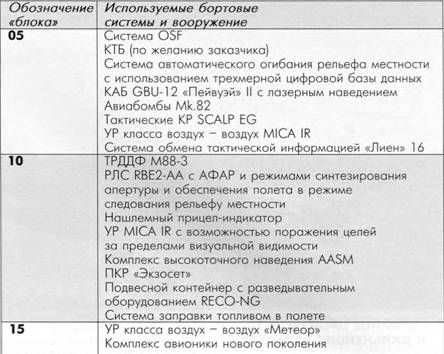 В середине 2006 г. в испытательном центре в Истре начались наземные и летные испытания истребителя «Рафаль» В (В301) с целью отработки систем и оборудования, которые должны использоваться на самолетах стандарта F3. Следует отметить, что между опытными и серийными самолетами «Рафаль» есть существенные различия. Например, на серийных используется усиленное шасси, так как их взлетная масса больше, чем у опытных: если опытным самолетам было разрешено взлетать с массой не более 19500 кг, то серийные могли сначала эксплуатироваться с максимальной взлетной массой 24500 кг, а затем 26000 кг. За счет технических усовершенствований серийные истребители обладают уменьшенной тепловой заметностью. Как было сказано выше, истребители «Рафаль» создавались в соответствии с требованиями ВВС и ВМС Франции. Тем не менее их конструкция может быть доработана, в результате чего самолеты могут выйти на внешний рынок. Фирмы «Дассо Авиасьон», «Талес» и «Снекма» приступили в 2001 г. к работам по программе с условным названием «Операейшн» Мк.2. Она предусматривает внедрение усовершенствованных систем, которые позволят удовлетворить пожелания зарубежных заказчиков. Установка таких систем должна финансироваться заказчиком, что будет оговариваться в контракте между покупателем и французским правительством. Как в случае с истребителями «Рафаль», поступающими на вооружение французских ВВС и ВМС с постепенным переходом от одного стандарта к другому, так и для экспортных самолетов предусматривается нечто подобное. Эти самолеты будут отличаться друг от друга модификациями, называемыми «блоками». Последовательность внедрения «блоков» показана в таблице. Некоторые работы в этом направлении уже ведутся. В частности, в 2000 г. «Дассо Авиасьон» провела испытания самолета, вооруженного КАБ GBU-12. На полигоне в Казо было выполнено несколько сбросов этих бомб с опытного двухместного истребителя «Рафаль» В01. КАБ GBU- 12 находятся на вооружении ВВС многих стран мира, во Франции ими оснащаются истребители-бомбарди- ровщики «Мираж» 2000D и «Супер Этандар», их носителями были и снятые недавно с вооружения истребители Jaguar. Предполагается, что «Рафаль» может также нести КАБ GBU-24 «Пейвуэй» III калибром 910 кг. Американская фирма «Рейтеон» предлагает приобрести УР класса воздух - воздух малой дальности AIM- 9Х, что позволит повысить экспортный потенциал истребителя.