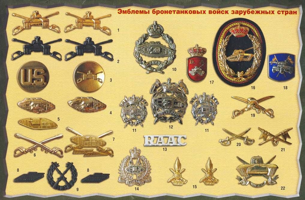 Продолжение. Начало см. в «ТиВ» №4,5,7/2009 г. Среди представленных в этой статье эмблем есть, по мнению автора, очень удачные, красивые, обладающие высокой художественностью, эстетичностью. Создатели этих эмблем – военные геральдики, художники, граверы – сделали их не только выполняющими исправно «различительную» и «декорирующую» функции, но и являющимися для военнослужащих конкретного рода войск «знаками гордости принадлежностью». Офицерские эмблемы бронетанковых войск армии Соединенных Штатов (1) были введены в 1951 г. Они носятся на лацканах воротника на парадно-выходной и повседневной форме. Изображение на эмблеме – вид спереди танка, наложенного на скрещенные сабли. Танк, судя по всему, – М26 «Першинг», который был назван так в честь генерала Д.Д. Першинга, основавшего американский танковый корпус в годы Первой мировой войны (американцы приступили к формированию собственного танкового корпуса 23 сентября 1917 г.). Эмблемы золоченые, размер (по сабле) – 43 мм, стоимость в 1985 г. – 5,95 долл. за пару. Следует отметить, что американские танковые войска, как и в других странах, создавались на базе предшествовавшего им высокоподвижного рода войск – кавалерии, что нашло отражение, в частности, в виде скрещенных на эмблеме сабель, являвшихся элементами кавалерийской эмблемы образца 1870 г. Именно эмблемы американских танкистов воспринимаются автором (и не только им) как одни их самых красивых (наряду с испанскими, китайскими, польскими и др.) и являющимися яркими представителями «знаков гордости принадлежностью». Офицерские эмблемы бронетанковых войск армии Соединенных Штатов для полевой формы (2) отличаются от описанных выше эмблем лишь тем, что они защитного цвета. Эмблемы для сержантов и рядовых (3) носятся на лацканах воротника. Хотя эмблемы парные, они несут разные изображения: слева – золоченый диск с буквами US, обозначающими страну – Соединенные Штаты; справа – золоченый диск с маленьким (30 мм) изображением офицерской эмблемы «танк и сабли». Другие офицерские воротниковые эмблемы бронетанковых войск (4) использовались в 1942-1951 гг. На них помещен английский танк MkV (в боковой проекции). Данные эмблемы практически повторяют эмблемы бронетанковых войск Великобритании. Эмблемы золотистые. Существовал еще один вариант использовавшихся в армии США в 1942-1951 гг. эмблем с изображением английского танка MkV (5). Современная эмблема разведывательных подразделений армии США (6) также включает эмблему кавалеристов как основной элемент. Представляет интерес так называемая «памятная эмблема» (7) – ромбовидный английский танк, наложенный на эмблему кавалерии. Цифры 1776 и 1917 на ленте говорят о датах рождения американских кавалерийских и танковых войск. В армии США существуют и так называемые «тренировочные эмблемы» (8,9). Это псевдоэмблемы бронетанковых и пехотных войск «предполагаемого противника», весьма отдаленно напоминающие советские эмблемы. Они использовались на учениях американских частей в Национальном тренировочном центре в Форте Ирвин. Изображение на кокарде бронетанковых войск Канады (10) включает стилизованный танк MkV (вид сбоку) на фоне лаврового венка, корону Георга VI вверху и ленту с надписью «Canada» внизу. Эмблема серебристая, крепление – две петли и шплинт. Воротниковая эмблема бронетанковых войск Австралии (11), одна из пары – левая. 