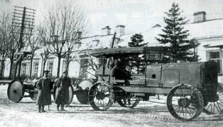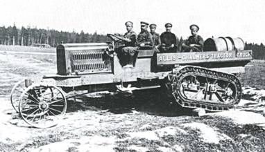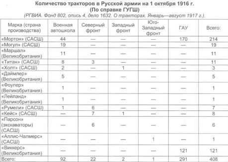 Тракторы автомобильного типа имеют конструкцию, сходную с конструкцией автомобиля и обладают способностью не только тянуть за собой грузы, но и нести некоторое количество их на себе. Сельскохозяйственные тракторы, вследствие громоздкости, тихоходности и малой применяемости к местности, имеют незначительное применение в военном деле. Наиболее применимы из них гусеничные тракторы, у которых скат задних колес заменен бесконечной роликовой лентой с закрепленными на ее наружной поверхности поперечными ребрами (гусеница)». Несмотря на низкую оценку Козлова пригодности сельскохозяйственных тракторов для военных нужд, их применение в качестве тяговой силы для артиллерии было довольно успешным как в годы Первой мировой войны, так и в других войнах первой половины XX столетия. Отчасти это была вынужденная мера по причине нехватки специальных артиллерийских тягачей. В связи с отсутствием в России для ведения боевых действий необходимого числа единиц механического транспорта 30 августа 1914г. Военным советом была утверждена закупка автомобилей, мотоциклов и тракторов за границей. Для этой цели в Англию направилась специальная закупочная комиссия. Ее председателем был назначен командир Военно-автомобиль- ной роты полковник П.И. Секретев. В состав комиссии также вошли преподаватель инженерной академии полковник С.Ф. Балдин, состоящий на службе в ГАУ инженер-технолог капитан И.А. Сидоркин, врач военно-автомобильной роты Е.Ф. Климович и заведующий мастерскими роты штабс- капитан В.А. Мгебров. Всего в 1914 г. комиссией было заказано 1276 автомобилей различного назначения и 15 паровых тракторов производства английской фирмы «Маршал». Согласно положениям Военного совета от 5 и 30 августа 1914 г. ГВТУ разрешалось приобрести за границей 1906 автомобилей и 74 трактора. С 1914 г. в артиллерийские части и военные крепости стали поступать закупленные в Англии и Америке паровые тягачи и тяжелые колесные тракторы с двигателями внутреннего сгорания, работавшими на нефти, а также полноприводные грузовики, предназначенные для транспортировки орудий. К концу первого года войны потребность действующей армии в тракторах, согласно предписания Ставки за №213 от 30 ноября 1914г., была определена в количестве «150 машин гусеничного, автомобильного и дорожного типов». Относительно типов тракторов Ставка дала следующие указания: «Наиболее желательными признаются в армии тракторы автомобильного типа, однако, при условии возможно меньшего давления на единицу площади обода колеса и, во всяком случае, с такой нагрузкой на колеса, которую выдерживают мосты на наш их грунтовых дорогах (250-300 пудов). Такие тракторы признаются желательными везде, где есть возможность движения по дорогам, хотя бы грунтовым. Вместе с тем в армии признается необходимым иметь при таких тракторах прицепные повозки с самостоятельным управлением.