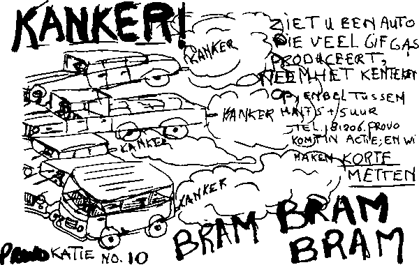 Важный аспект этого демократического процесса — отношения между учащимся и учителем. Директора школ постоянно навязывают принцип «коллектив всегда прав», оказывающий разрушительное влияние на личность, заметное по низкой успеваемости. Школа — это в первую очередь живое сообщество, в которое каждый входит на равных правах. В качестве революционного ответа на эту проблему мы предлагаем учредить S.O.S., STICHTING OPSTANDIGE SCHOLIEREN (Институт революционных учеников), который займется выполнением БЕЛОГО ШКОЛЬНОГО ПЛАНА. Если директора не прислушаются к требованиям Белого школьного плана, мы заставим их уйти в отставку при помощи крупномасштабных действий, таких, как школьные забастовки, бойкот учителей, сит-ины, сит-дауны (с использованием дымовых шашек или без), воспламеняющиеся листовки и т.п. Мы взываем к каждому ученику средней школы, который все еще видит проблески надежды в темных тучах, что повисли над ним или над ней: приходите в здание De Doelen на Kloveniersburgwal, 87 в субботу, 29 октября, в восемь часов вечера, чтобы дать старт Белому школьному плану. Если кворум будет велик, этот вечер войдет в историю голландской культуры как одно из самых заметных событий в ходе социальной революции в образовании. Тихая процессия Амстердамцы! Полицейское насилие на сможет остановить хэппенинги вокруг ЛИВЕРДЬЕ, ЗОМБИРОВАННОГО ПОТРЕБИТЕЛЯ БУДУЩЕГО. Хэппенинг — это магическое событие, и ни униформы, ни шашки, ни резиновые дубинки не в силах изменить что-либо. Анархистское движение «ПРОВО» издает следующее воззвание: Пусть люди, принимающие участие в хэппенингах, последуют примеру католиков и устроят молчаливую процессию по воображаемому МАГИЧЕСКОМУ КРУГУ вокруг Ливердье. СМИРЕНИЕ, ТИШИНА Участники узнают друг друга по знаку «Окись углерода» на своих косынках. ЦВЕТЫ к ногам Ливердье. ШШШ! ШШШ! ШШШ! ШШШ! ШШШШШ! (ПРОВОКАЦИЯ № 6)