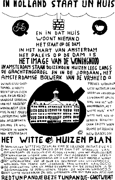 Ваш дом - храм удовольствия. У вас есть право на свой собственный дом и на то, чтобы разделить его с коммуной. Ни один дом в Магическом Центре не снесут, если он будет занят жильцами. Новый Амстердам! Белый жилищный план, предложенный Прово, - это революционное решение жилищной проблемы. За Белый дом! Каждый может войти в Белый дом и выбрать свою собственную квартиру. Новый Вавилон! БЕЛЫЙ ЖИЛИЩНЫЙ ПЛАН. Комитет по реализации Белого жилищного плана предпринимает следующие шаги: 1. провозглашение дворца на площади Дам всеобщим храмом Клааса, сердцем Магического Центра; 2. еженедельная публикация адресов свободных домов для распространения списка в субботу в 10 часов утра на площади Дам; 3. покраска дверей и карнизов свободных домов в белый цвет для того, чтобы показать, что каждый может в них поселиться; 4. создание агентства занятости для молодых людей, которые летом будут бороться против сокращения городского жилищного фонда; 5. Белый жилищный план станет частью Плана Нового Амстердама. СПАСИ ДОМ, ЗАЙМИ ДОМ ПРОСТО ДЛЯ СВОЕГО УДОВОЛЬСТВИЯ. Комитет нижайше просит Вас о предоставлении почти постоянно пустующего дворца на площади Дам для обустройства в нем творческого центра. Тогда молодые люди Амстердама получат возможность использовать свой творческий потенциал в позитивном ключе. С Призыв к провотариату К тому времени, как эта листовка ушла в печать, у нас все еще не было помещения для проведения ХЭППЕНИНГОВ. Переговоры с властями идут до сих пор... ДОЛЖЕН ЛИ ПРОВОТАРИАТ СНОВА ВЫЙТИ НА УЛИЦЫ? Вероятно, нет: уж слишком там холодно — кровь стынет в жилах. Этой зимой власти предлагают нам Вонделпарк. Очевидно, они хотят, чтобы мы там все закоченели. На прошлой неделе провос уже использовали этот «УГОЛОК ОРАТОРОВ», когда 5 (пять) испанских провос были ЗАДУШЕНЫ НАСМЕРТЬ. Сегодня в 8 часов вечера провос снова собираются в УГОЛКЕ ОРАТОРОВ, ВОНДЕЛПАРК. Встречаемся возле ворот Лейдсебосье, около БЕЛОЙ СКАМЬИ, где будет оглашен дальнейший маршрут. ВСЕ ТУДА. ВСЕ ТУДА, ВСЕ ТУДА Остерегайтесь собаки... держитесь подальше от Коппейанского цирка. КАК, ЧТО, ГДЕ???????? ВОССТАНОВЛЕНИЕ ИСПАНСКОЙ ИНКВИЗИЦИИ!!!!!!! Смерть от удушения... смерть от холода. НЕ РЕШАЕМ - МЕШАЕМ, БУШУЕМ! Белый школьный план ПРИЗЫВ К ДЕЙСТВИЮ! Не имеете возможности использовать свои мозги? Вас: — выперли из школы, временно или надолго; — отправили на штрафные работы, остригли, а может, даже высекли. Пришло время для учеников средних школ действовать всем вместе, встряхнуться, объявить себя свободными, сокрушить ярмо догматического консерватизма при помощи нескольких Белых планов. Они должны взять демократический процесс в школах в свои руки, потому что школьное начальство в школах и за их стенами цепляется за допотопные стандарты, основанные на зубрежке и отравляющие атмосферу получения знаний.