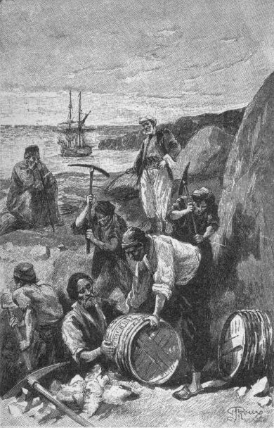 Камильк-паша держался в отдалении, как всегда задумчивый и грустный, мучимый своими неотвязными мыслями. Он спрашивал себя: не лучше ли ему лечь рядом со своими сокровищами и уснуть вечным сном?.. И в самом деле, где бы он нашел более надежное убежище от человеческой несправедливости и коварства? Когда бочонки были опущены в глубину ямы, Камильк-паша взглянул на них в последний раз. В ту минуту вид его показался капитану до того странным, что он не удивился бы, если бы Камильк-паша отменил свой приказ, отказался от плана, который он так долго лелеял, и снова пустился бы в море со своими сокровищами. Но нет, он жестом велел продолжать работу. Тогда капитан приказал плотно установить бочонки — один подле другого, — засыпать осколками кварца и скрепить цементом. Вскоре образовалась сплошная масса, не менее твердая, чем скалы самого острова. Сверху еще наложили груду камней, сцементированных между собой таким образом, что свободное пространство заполнилось до самой поверхности и составило одно целое с каменистой почвой. Пройдет немного времени — дожди и шквалы отполируют поверхность, и будет невозможно найти место, где был погребен клад. А потому необходимо было оставить какой-нибудь неизгладимый знак, который позволил бы в нужный момент отыскать сокровенное место. На вертикальной стене скалы, позади ямы, боцман нанес с помощью резца монограмму, в точности воспроизводившую обычную подпись Камильк-паши — два «К» — первая и последняя буквы его имени.